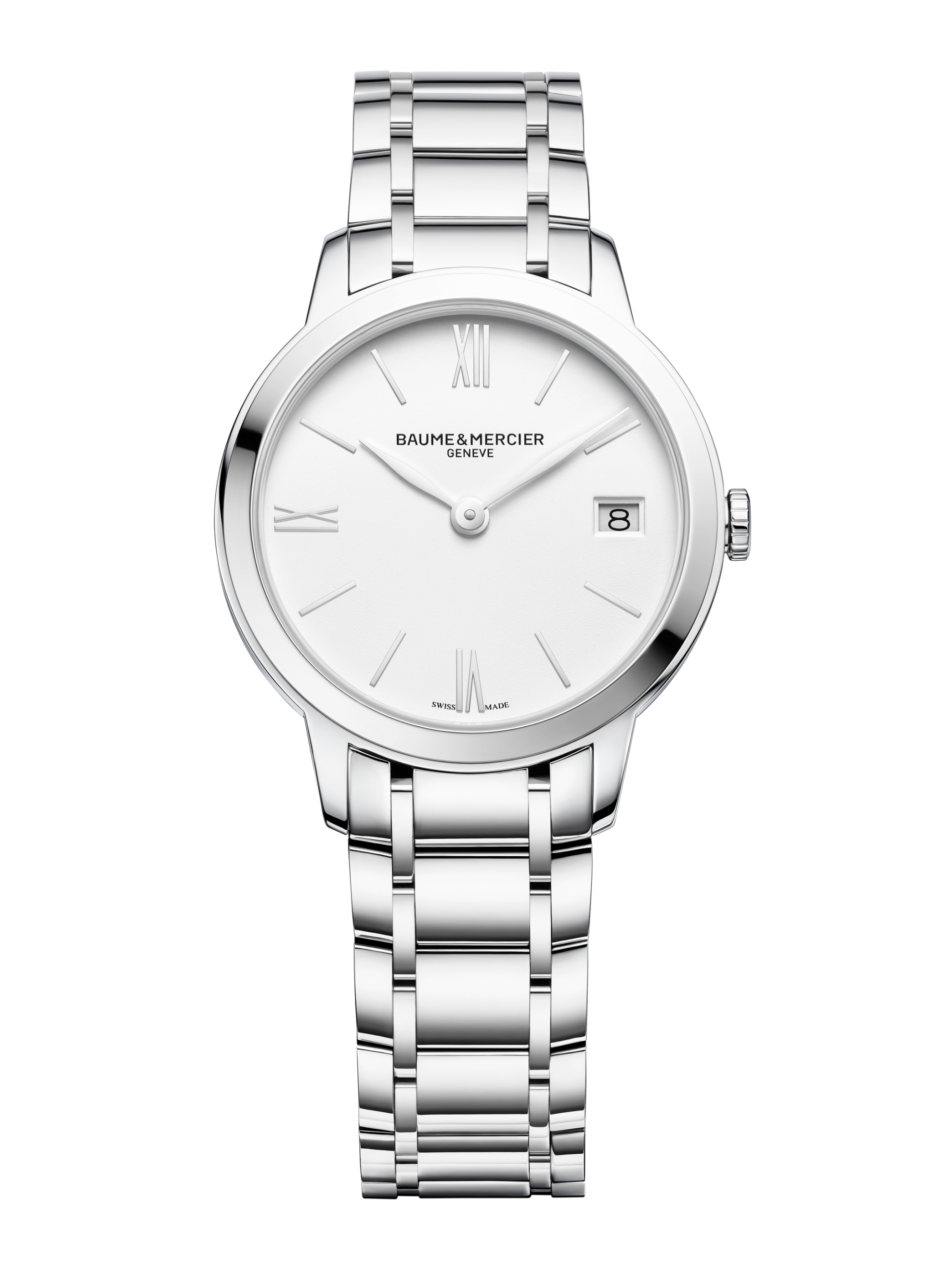 A womenÕs steel watch that balances strength and elegance, the Classima 10335 has a round 31 mm stainless steel case and matching bracelet with a triple folding clasp and security push-pieces. The rhodium-plated hands sweep around the pure white dial, which features classic Roman numerals and a date aperture at 3 oÕclock. This urban chic steel bracelet watch for her is driven by Swiss made quartz movement.