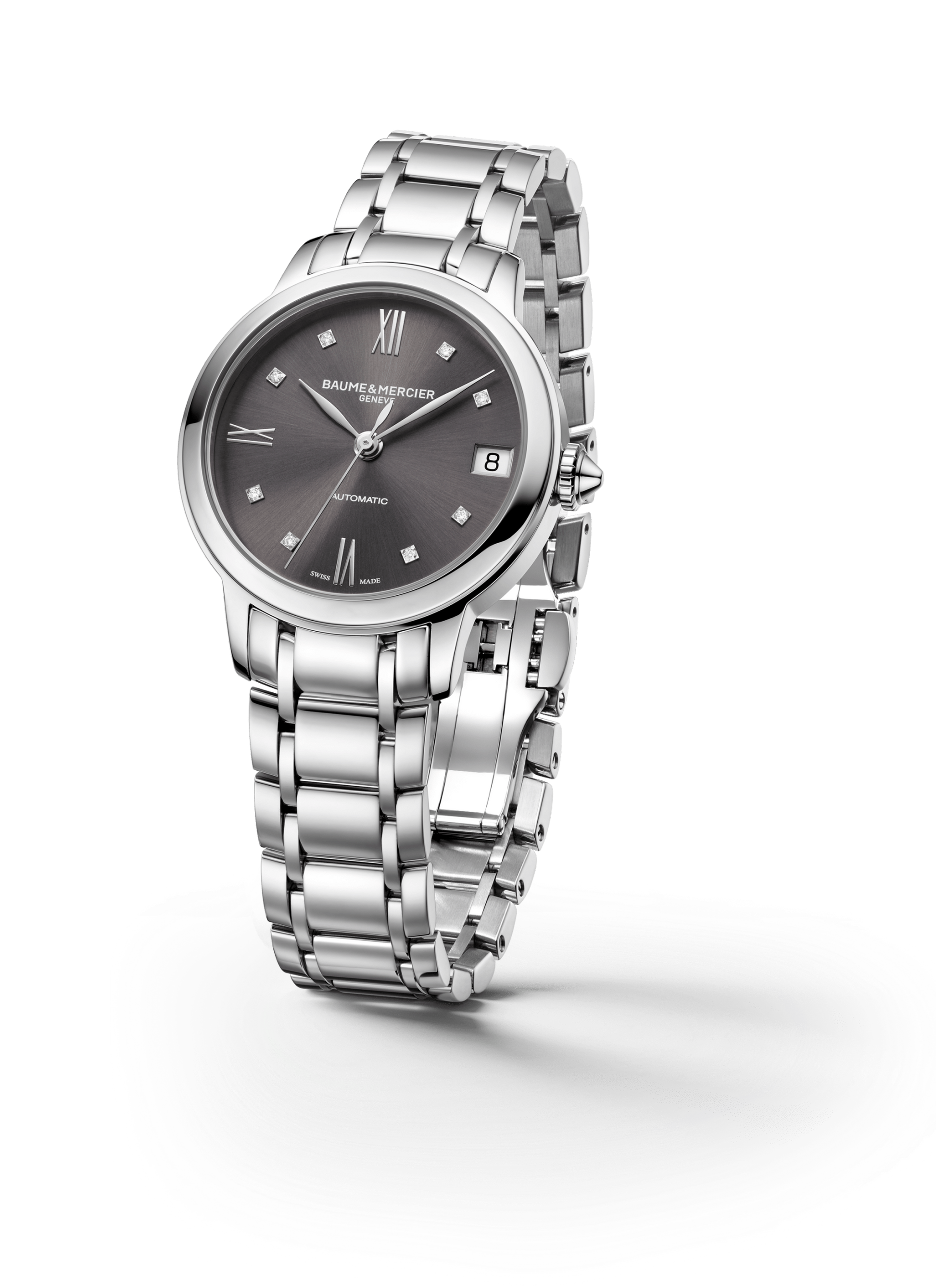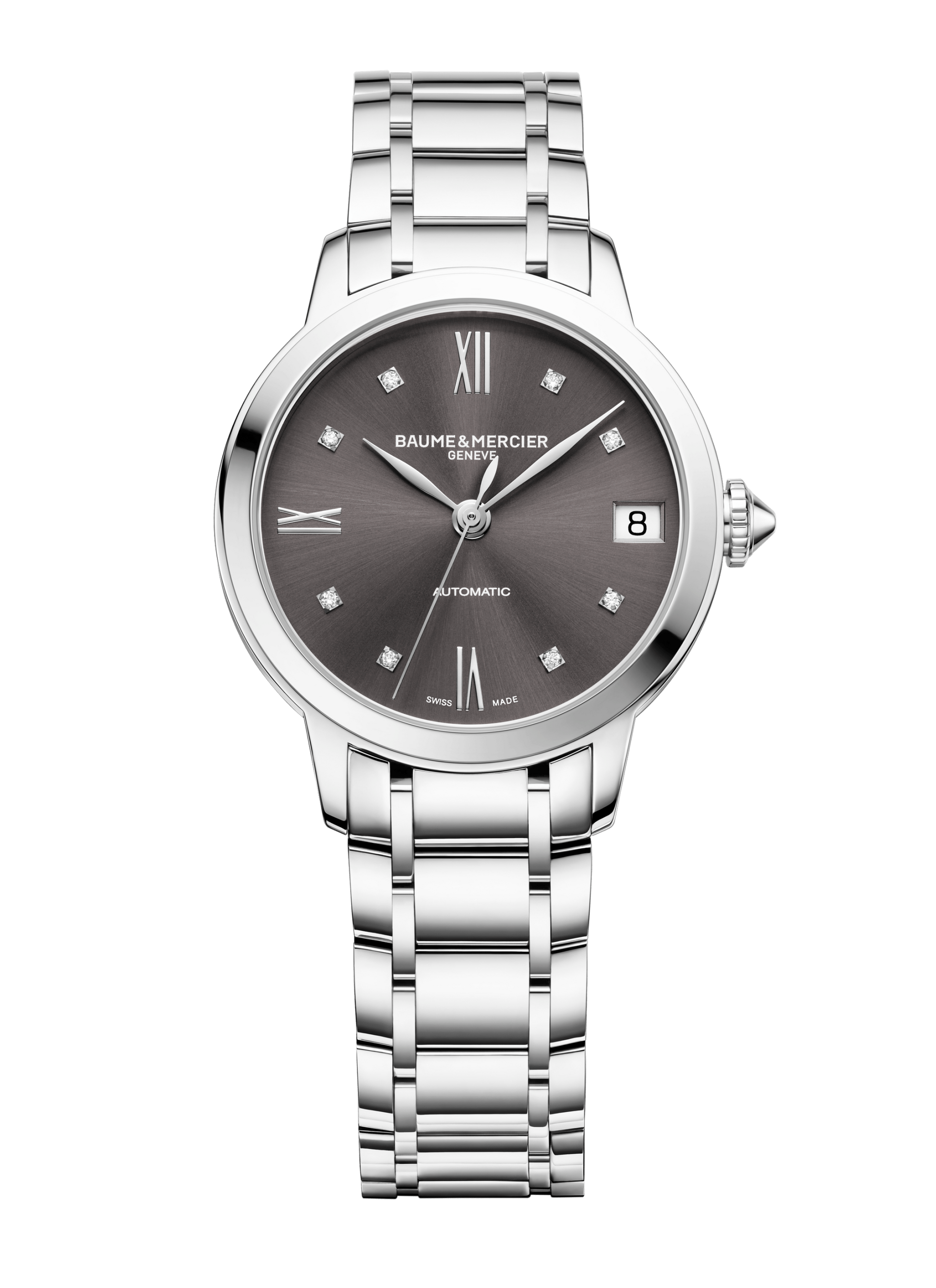 This ladies automatic watch features an elegant slate-gray dial set with diamond indexes and Roman numerals at the quarter-hours. The polished stainless steel bracelet and case complete the urban-chic look of this Swiss-made wristwatch.