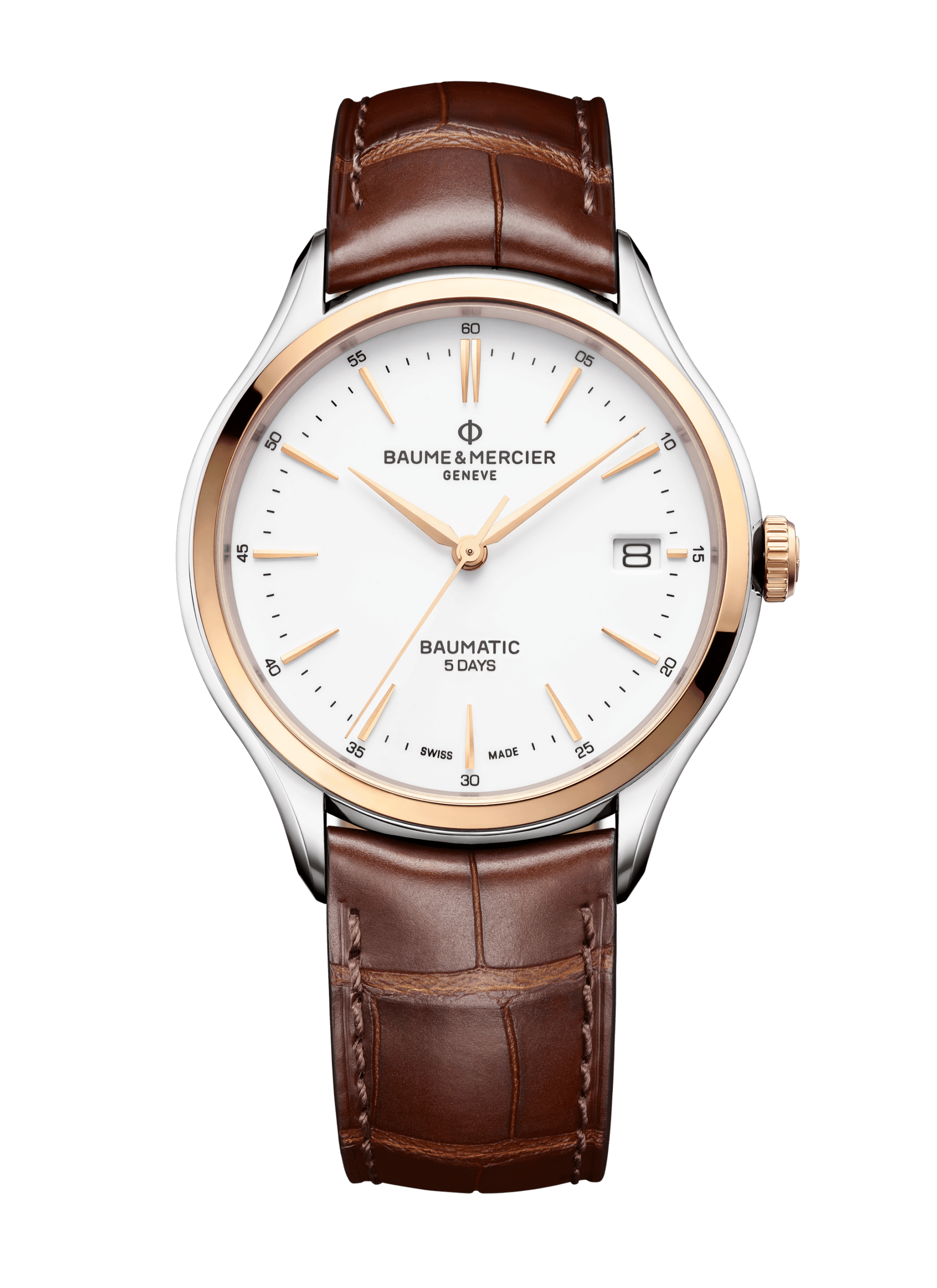 The immaculate white dial offers an understated, easy-to-read display. It features slender riveted hour-markers, slim lancet hands and an oversized date aperture at 3 oÕclock. Topped with a domed sapphire crystal, the anthracite gray minute track follows the ideally proportioned curves of the 40 mm polished/satin-finished case. Water-resistant to 50 meters, the timepiece has a transparent case back that reveals the new Baumatic BM12-1975A calibre, the first mechanical self-winding movement developed in-house, in collaboration with the Richemont group. The watch is mounted on a brown alligator strap that fastens with a pin buckle.