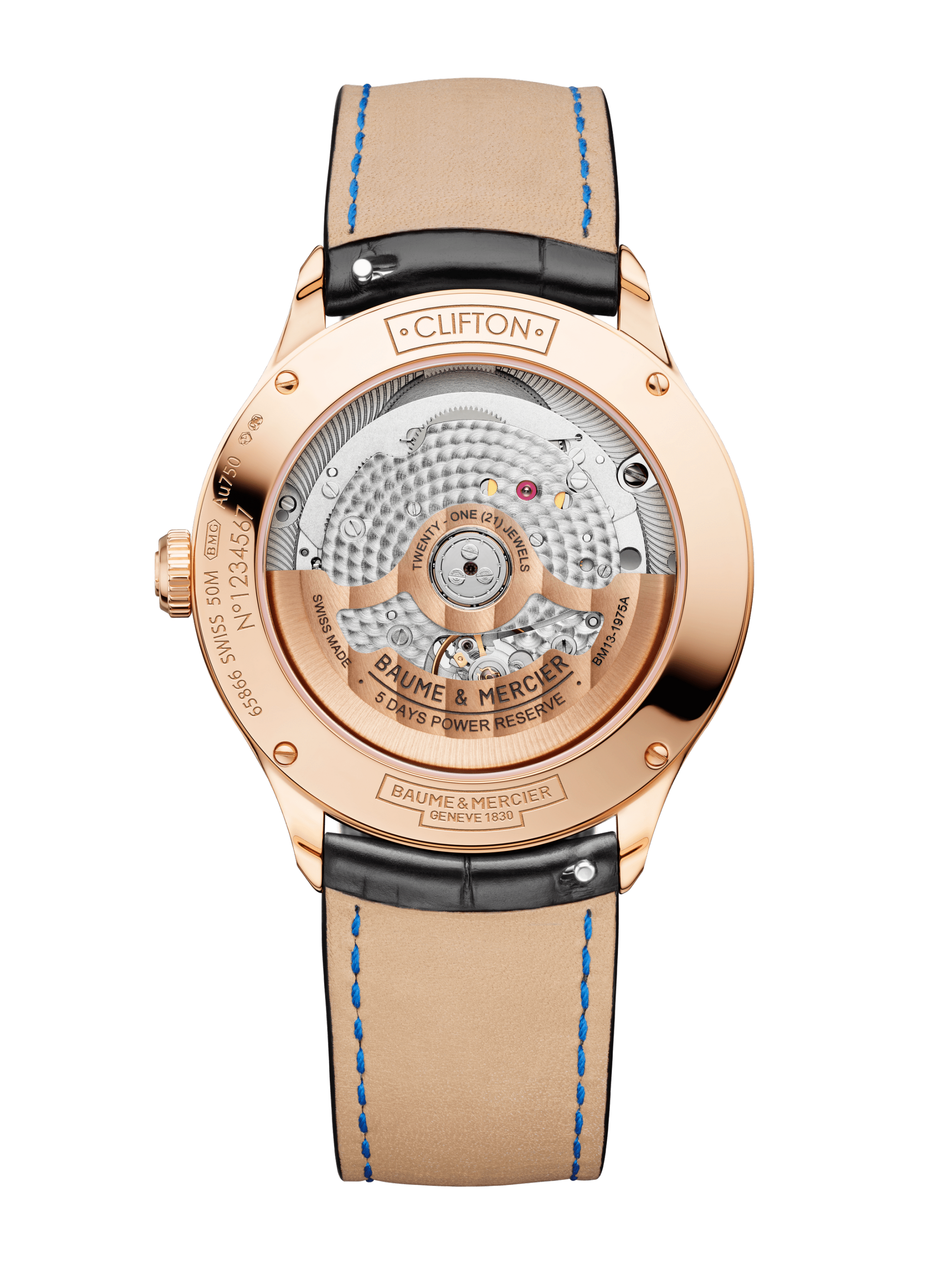 A menÕs chronometer watch pairing a warm-white dial with a polished 18K pink gold case, the Clifton Baumatic 10469 expresses modern refinement. This gentlemanÕs watch features a black alligator strap with grey stitching.