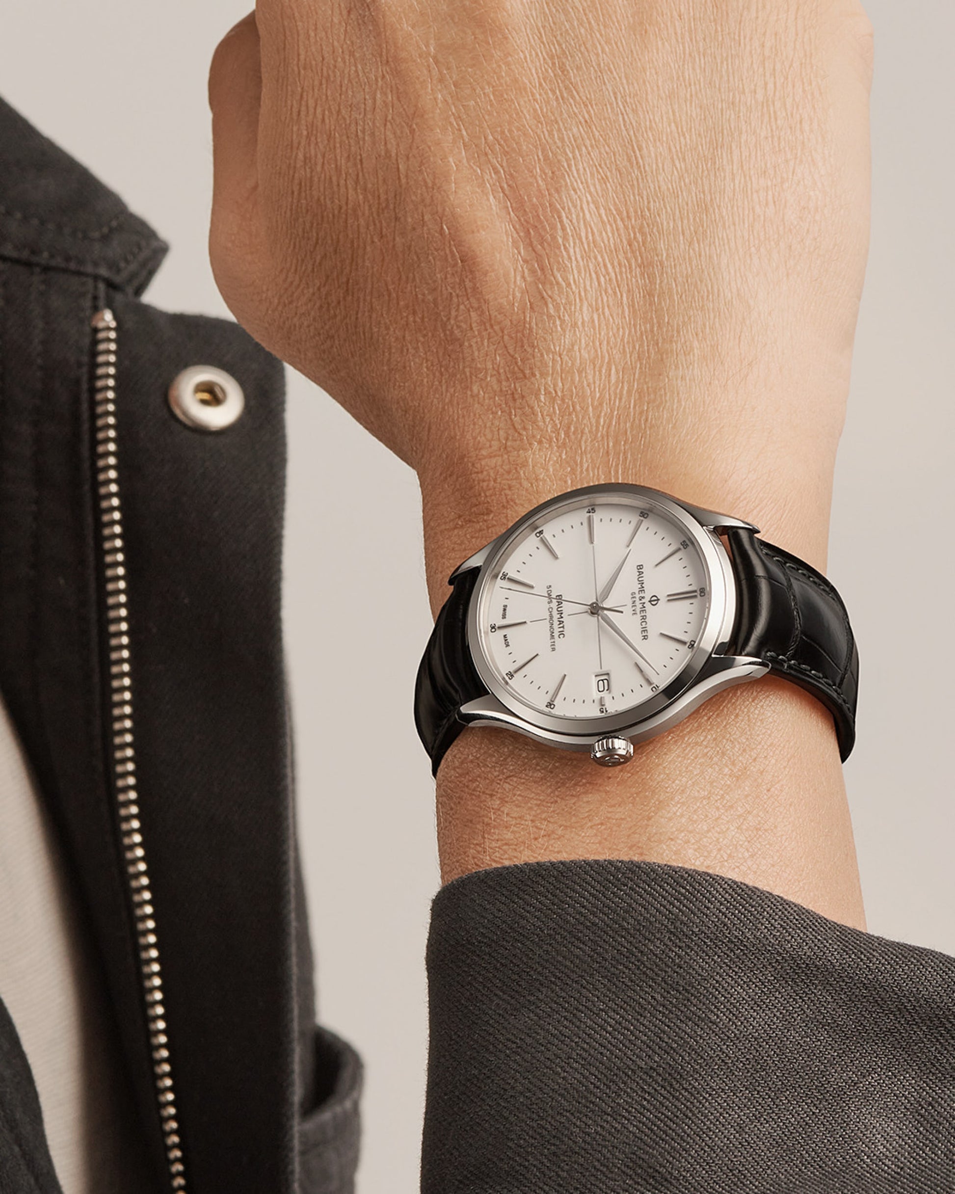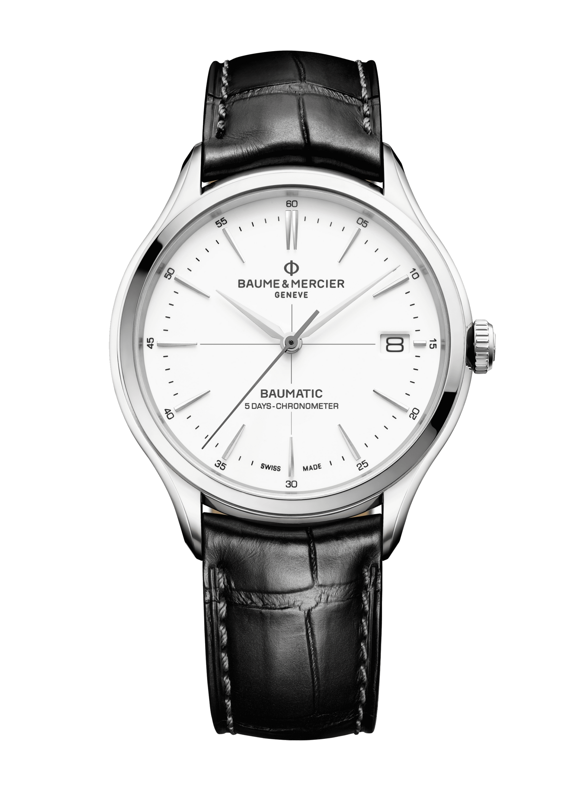 A sophisticated gentlemanÕs wristwatch, the Clifton Baumatic 10518 is an automatic date watch for men, manufactured with a manufacture self-winding calibre. Its balanced aesthetic pairs a timeless black alligator strap with a white dial, featuring both hour and minute time markers and the iconic date aperture at 3 oÕclock. The steel case is finished with a transparent sapphire case back, through which the COSC automatic movement can be observed.