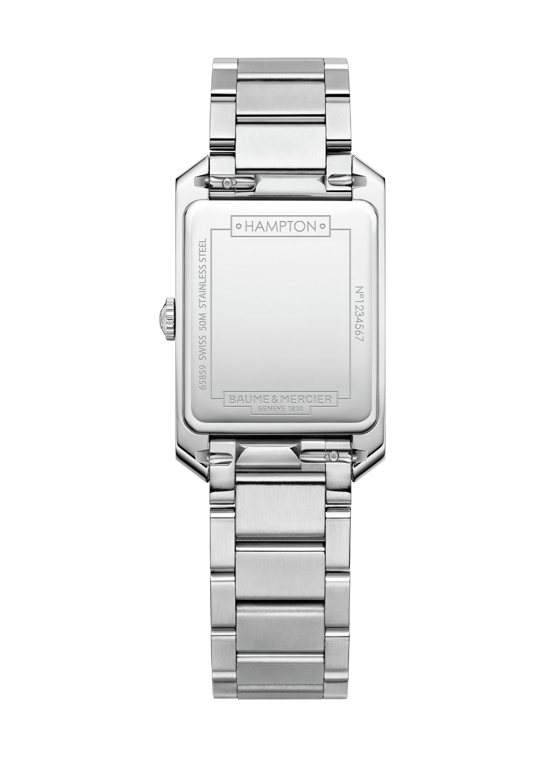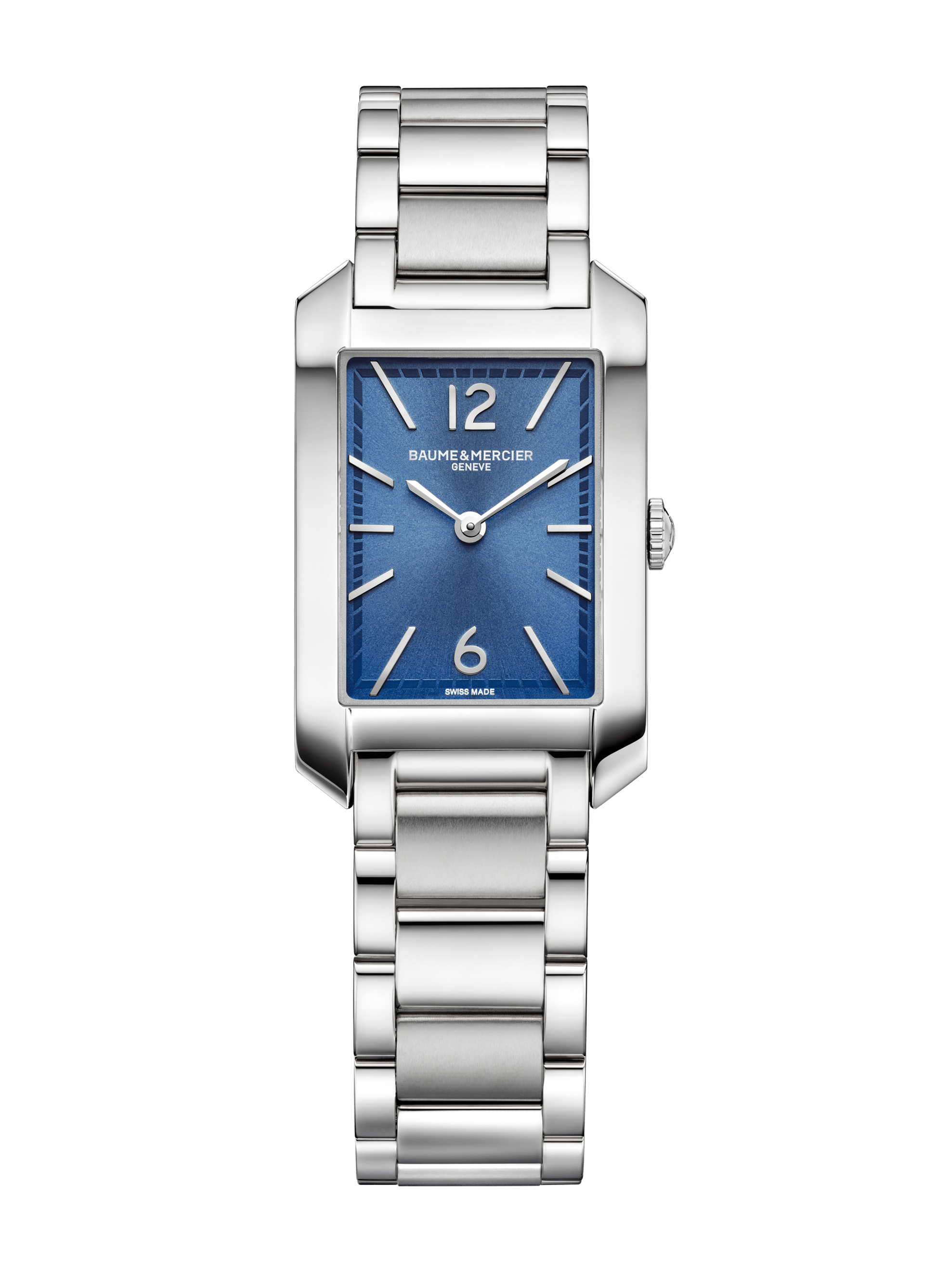 The Hampton M0A10476 combines a chic aesthetic with the luxury of the Swiss watchmaking. This rectangular watch for women features a sun satin-finished blue dial and a polished steel case with a matching stainless steel bracelet.