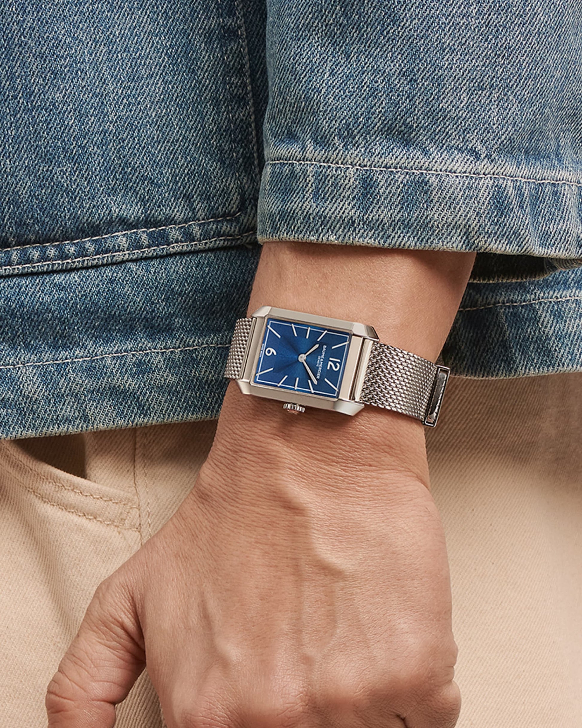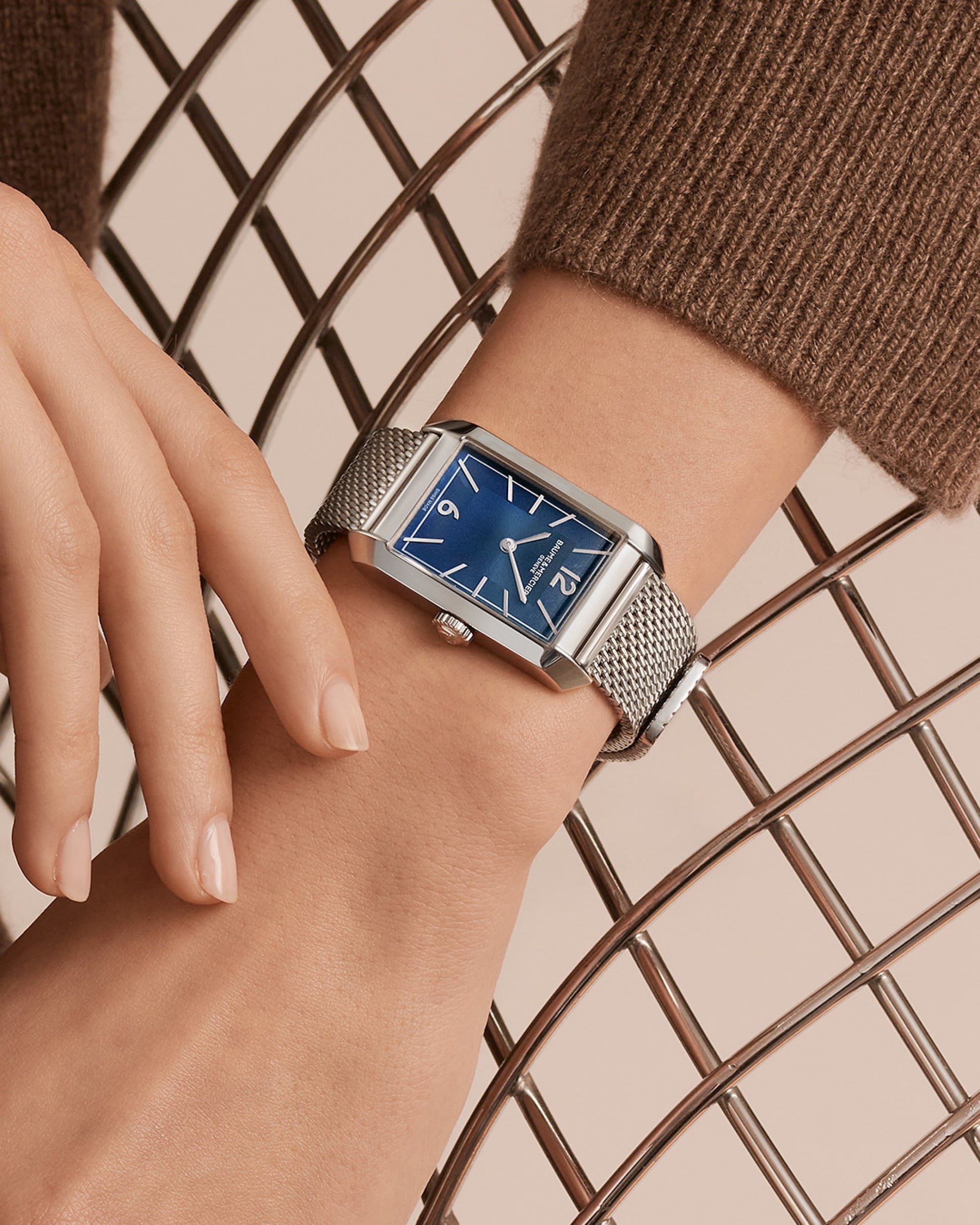 The Hampton 10671 combines a chic aesthetic with the luxury refinement of the Swiss watchmaking. This rectangular watch features an Opaline and grained silver-coloured dial. The timepiece is mounted on an interchangeable integrated milanese polished stainless steel bracelet that gives a unique vintage look to your outfit.