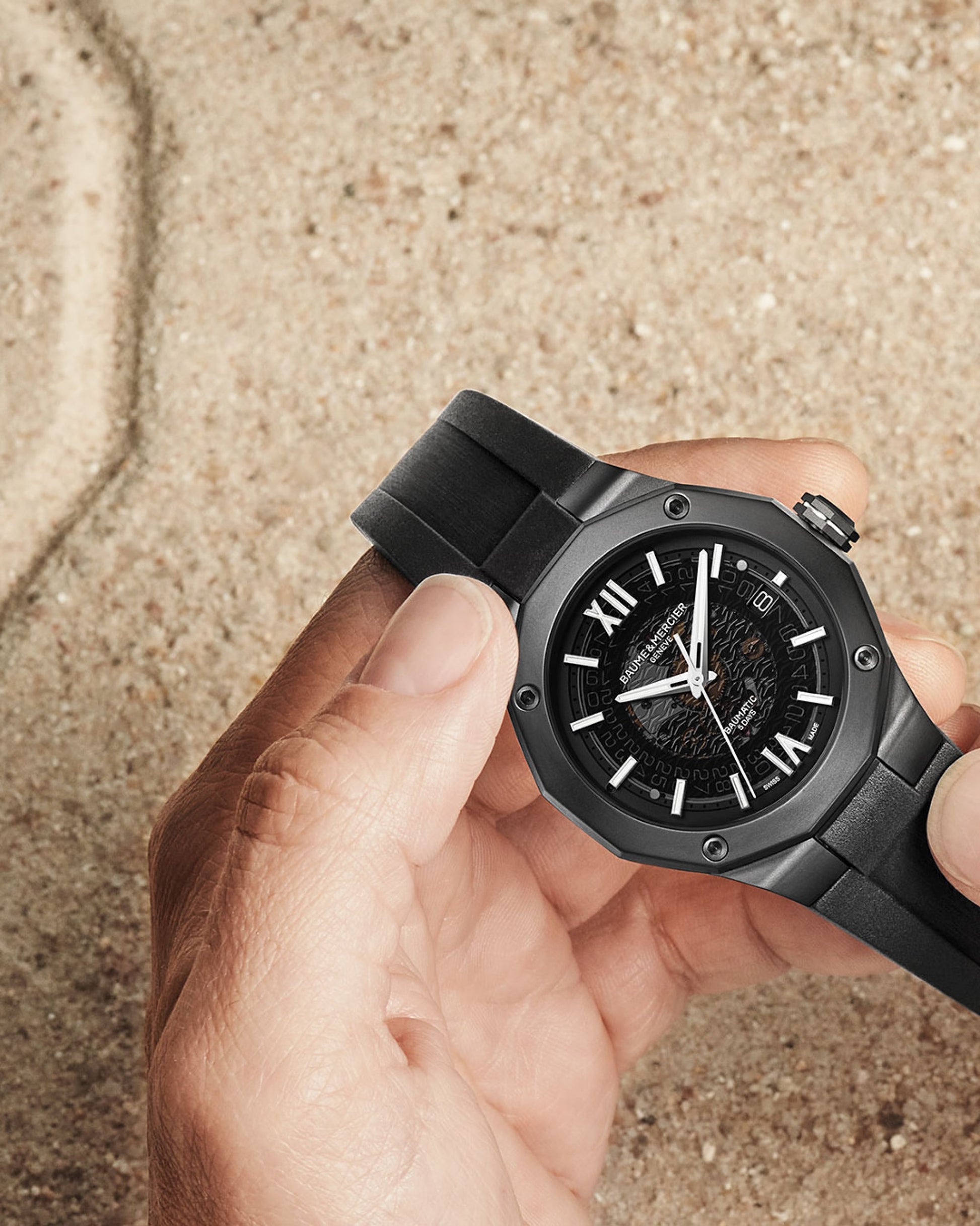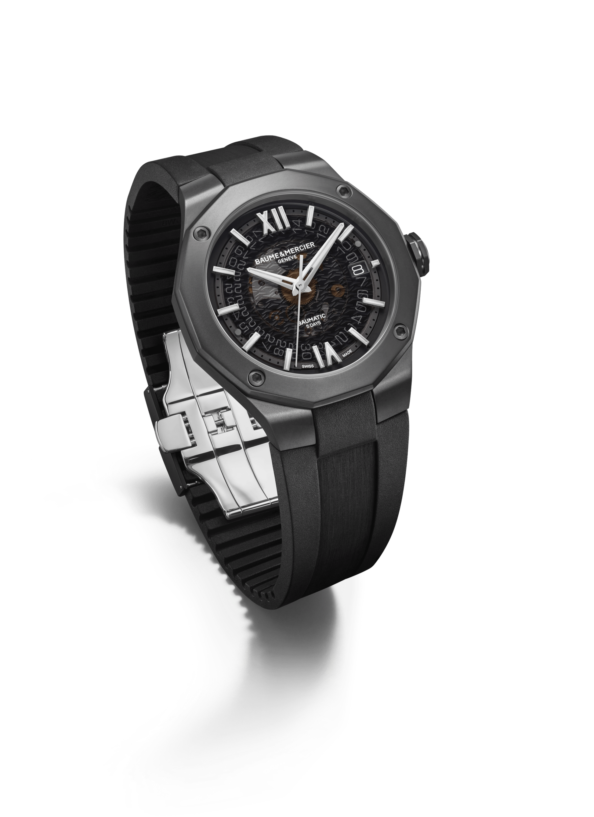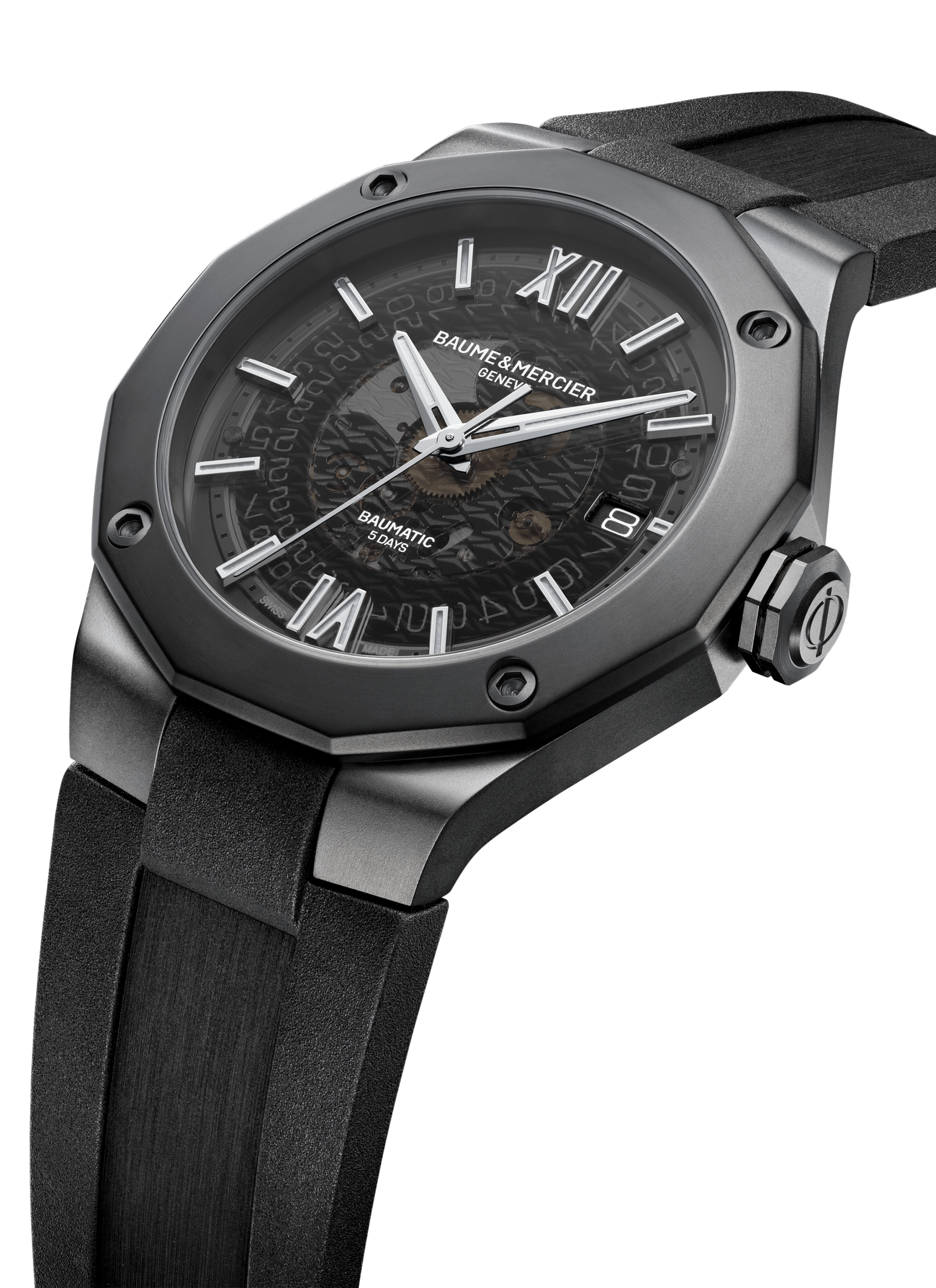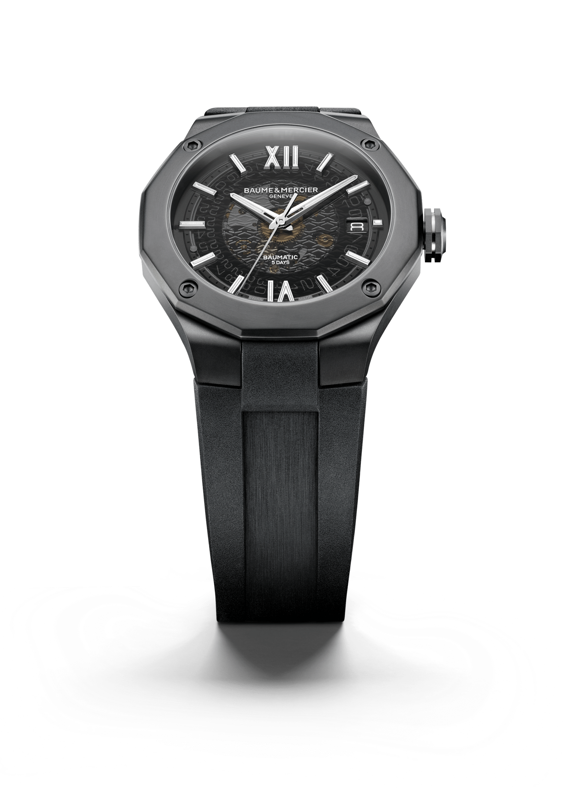 Driven by the prestigious Baumatic manufacture calibre, the Riviera 10617 is the subtle combination of refined and sporty look. Displaying a smoked sapphire gray dial and a black steel-ADLC dodecagonal case, this distinctive silhouette is finished with a black rubber strap for an ultimate black look.